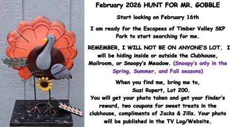 The purpose of the Timber Valley Website, (timbervalleyskp.com) is to inform members and visitors of pertinent Park news, events and items of interest. We will prioritize contributions from Members. We will, at all times, strive to be neutral in all affairs and promote unity and the well-being of all Park Members.In order to meet the expectations of Members, there are some topics that will not be posted: